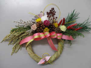 | 指導内容 | (1)洋風しめ飾り(ワラや稲穂を使います) (2)フラワーデザイン(生花、造花、ドライフラワー、野山の木の実等使用) (3)布ぞうり(着古したTシャツ等、何でも使用) |